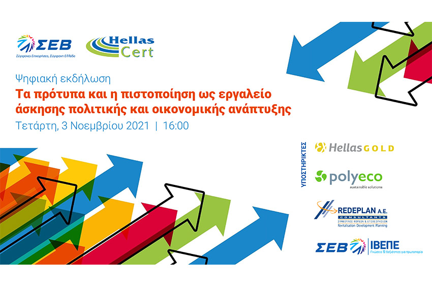 Ο ΣΕΒ σε συνεργασία με την Ελληνική Ένωση Διαπιστευμένων Φορέων Επιθεώρησης Και Πιστοποίησης (HellasCert) διοργανώνουν διαδικτυακή εκδήλωση με θέμα «Τα πρότυπα και η πιστοποίηση ως εργαλείο άσκησης πολιτικής και οικονομικής ανάπτυξης», την Τετάρτη 3 Νοεμβρίου 2021 και ώρες 16:00-18:00.